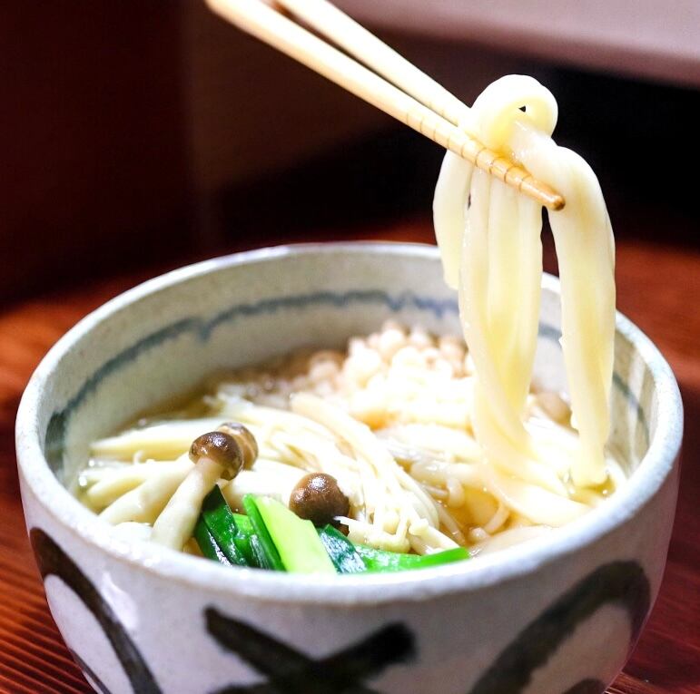みやざき地頭鶏の豊かな旨味が詰まった「みやざき地頭鶏うどん」は、鶏ガラをふんだんに使用し、長時間弱火でじっくりと煮だした黄金色のつゆが自慢の一品です。鶏の風味が際立ち、どこかホッとする味わいが楽しめます。